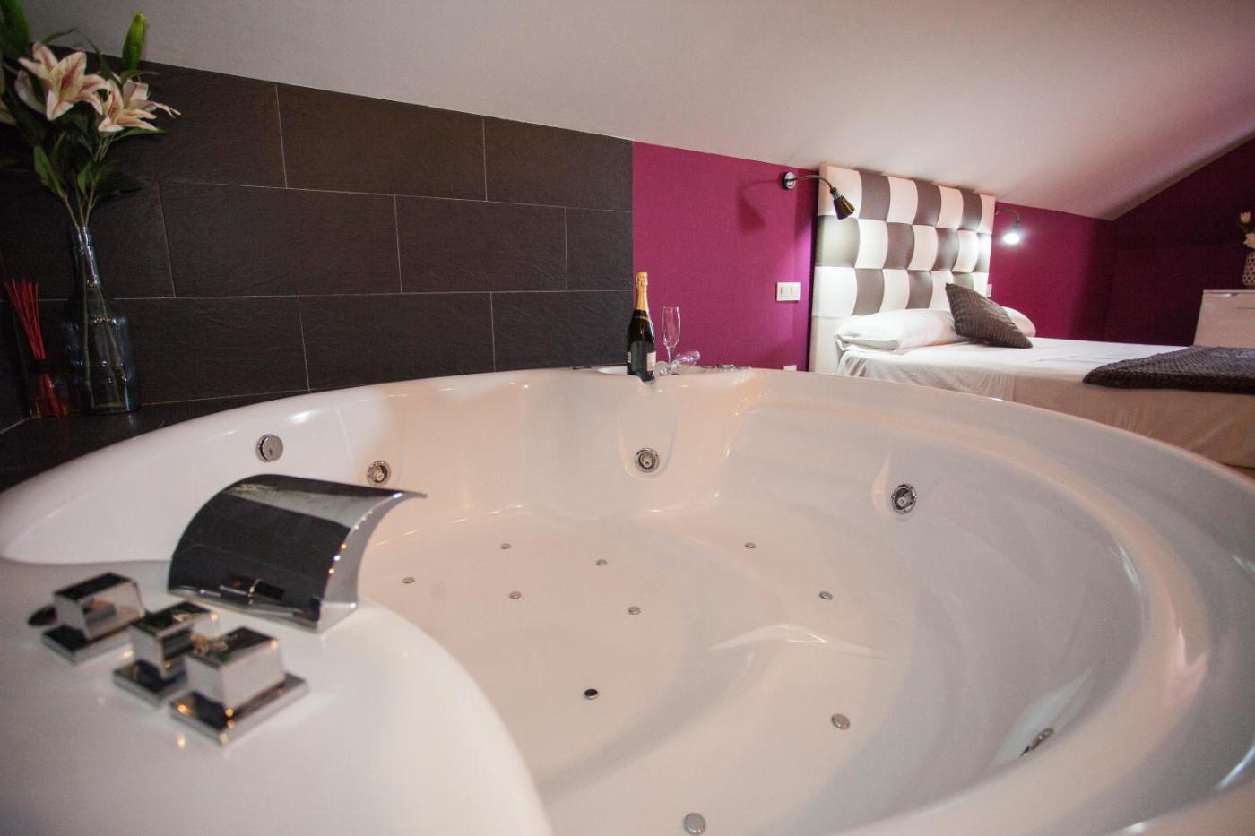 Suite con bañera de hidromasaje y cama grande. Esta suite incluye bañera de hidromasaje. Cuenta con entrada privada, aire acondicionado, sala de estar, 1 dormitorio independiente y 1 baño con ducha. La suite incluye sofá, suelo de baldosa, calefacción y TV. La unidad dispone de 2 camas.
