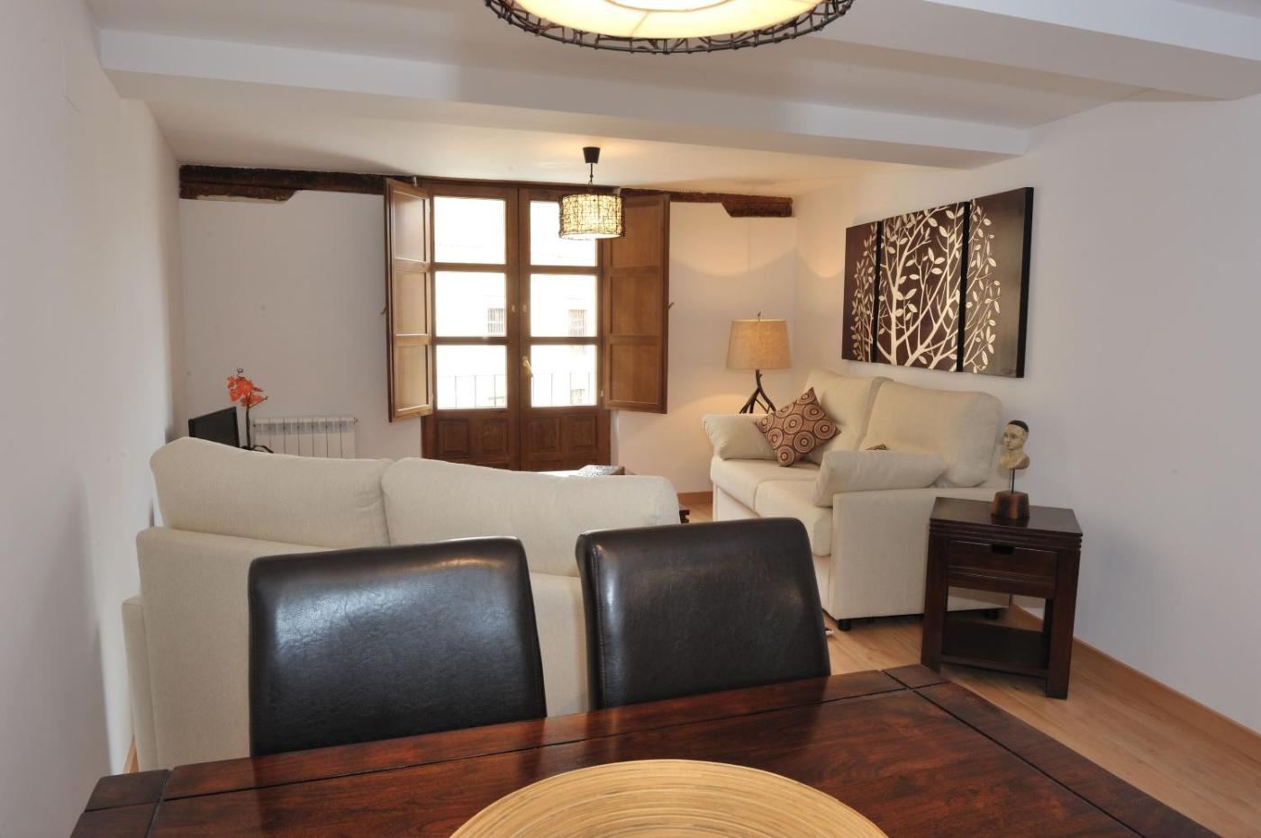 Los apartamentos del Balcón de la Catedral tienen suelos de parqué, vigas de madera a la vista, una bonita sala de estar y una cocina con fogones, microondas y cafetera.