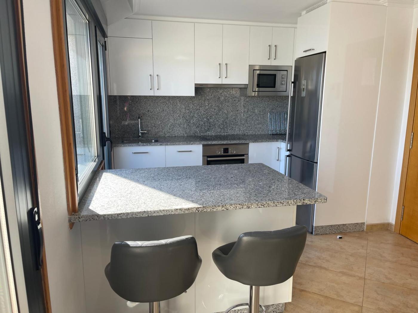 El apartamento tiene 2 dormitorios, 1 baño, ropa de cama, toallas, TV de pantalla plana, zona de comedor, cocina totalmente equipada y terraza con vistas a la ciudad.