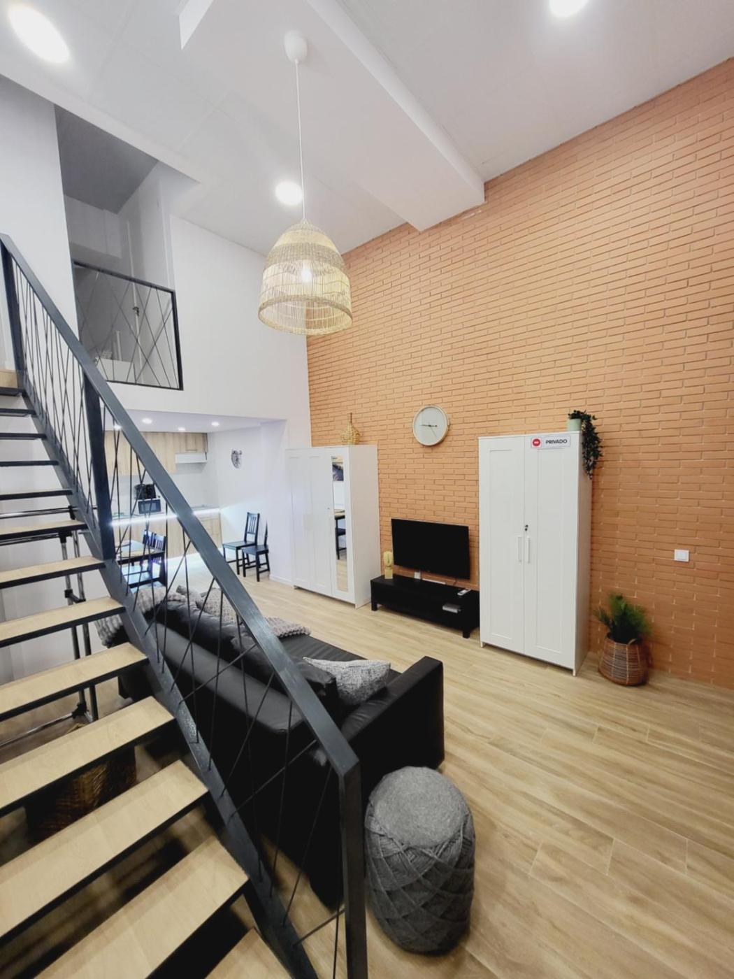Suite Dúplex. Esta suite es amplia e incluye sala de estar, 1 dormitorio independiente y baño con ducha y artÃculos de aseo gratuitos. La cocina está bien equipada con fogones, nevera, utensilios y microondas. Esta suite cuenta con aire acondicionado, TV de pantalla plana, lavadora, entrada privada y paredes insonorizadas. El alojamiento cuenta con 3 camas. ;