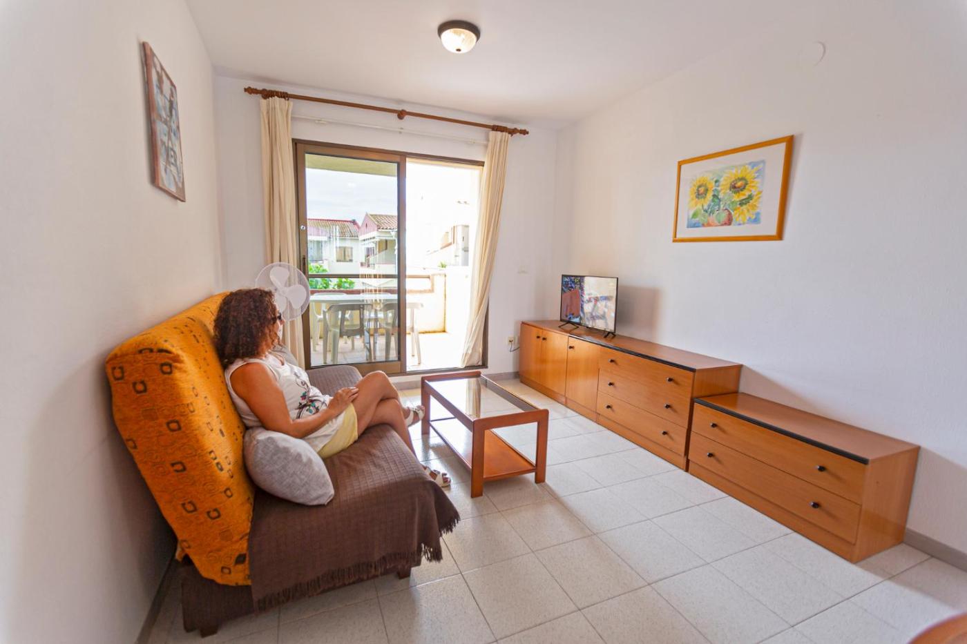 Apartamento de 2 dormitorios (5 adultos). Alojamiento con 1 dormitorio con 1 cama doble y 1 dormitorio con 2 camas individuales. Tiene sala de estar con sofá cama, terraza, 1 baño y cocina de planta abierta con microondas, nevera y cafetera. ;